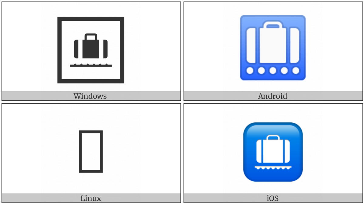 The image below shows how the “Baggage Claim” symbol might look like on different operating systems. If the font in which this web site is displayed does not contain the symbol and there is no fallback font able to render it, you can use the image below to get an idea of what it should look like.