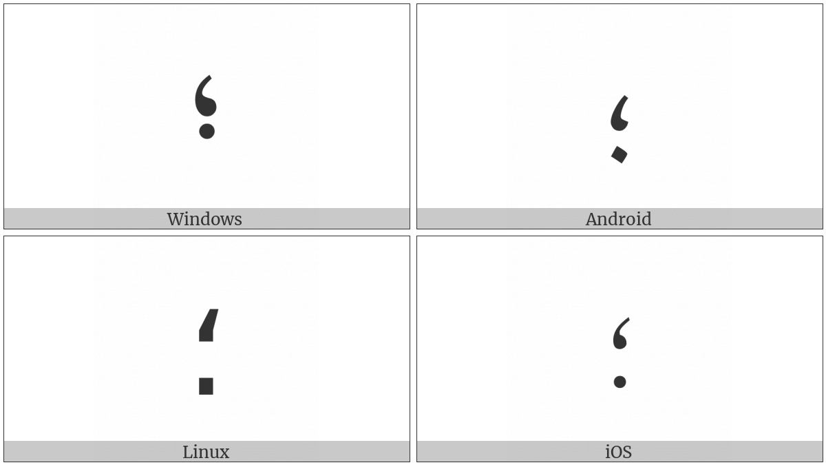 The image below shows how the “Arabic Semicolon” symbol might look like on different operating systems. If the font in which this web site is displayed does not contain the symbol and there is no fallback font able to render it, you can use the image below to get an idea of what it should look like.