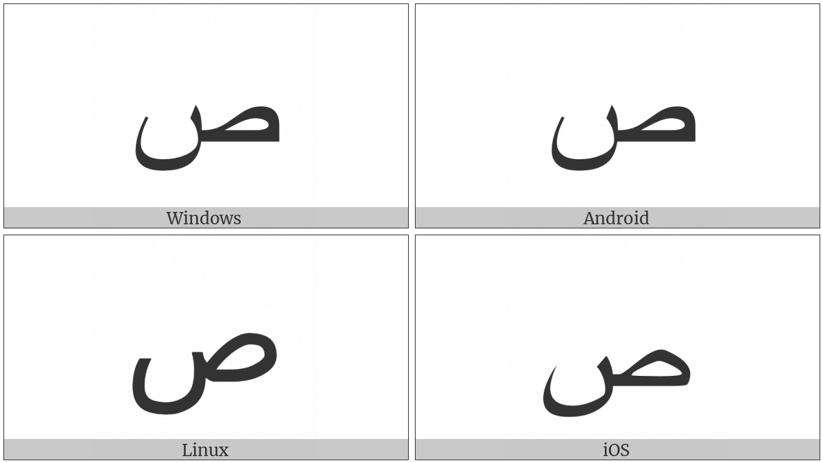 The image below shows how the “Arabic Letter Sad” symbol might look like on different operating systems. If the font in which this web site is displayed does not contain the symbol and there is no fallback font able to render it, you can use the image below to get an idea of what it should look like.