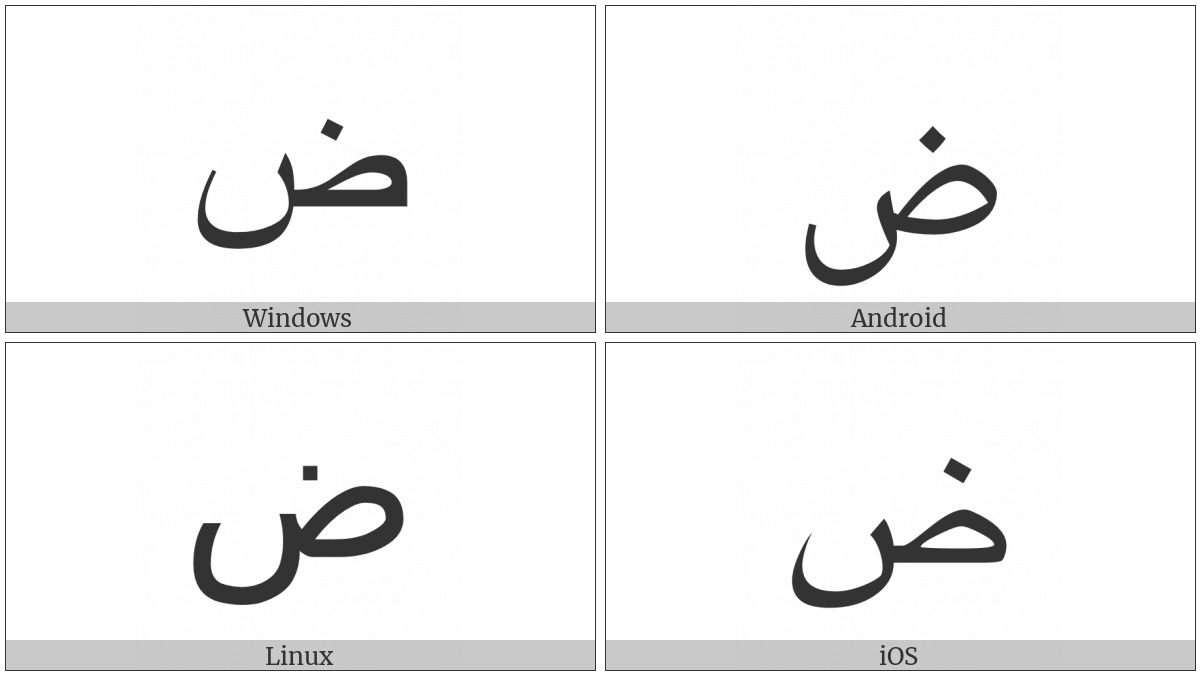The image below shows how the “Arabic Letter Dad” symbol might look like on different operating systems. If the font in which this web site is displayed does not contain the symbol and there is no fallback font able to render it, you can use the image below to get an idea of what it should look like.