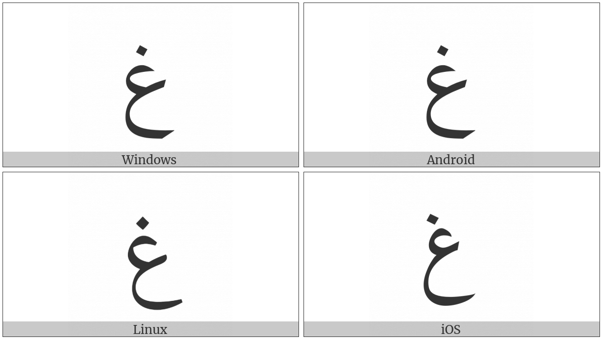 The image below shows how the “Arabic Letter Ghain” symbol might look like on different operating systems. If the font in which this web site is displayed does not contain the symbol and there is no fallback font able to render it, you can use the image below to get an idea of what it should look like.
