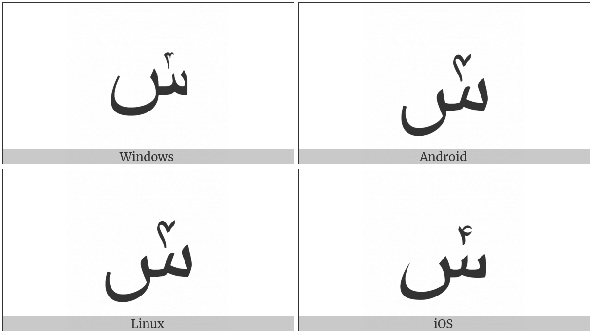 The image below shows how the “Arabic Letter Seen With Extended Arabic-Indic Digit Four Above” symbol might look like on different operating systems. If the font in which this web site is displayed does not contain the symbol and there is no fallback font able to render it, you can use the image below to get an idea of what it should look like.