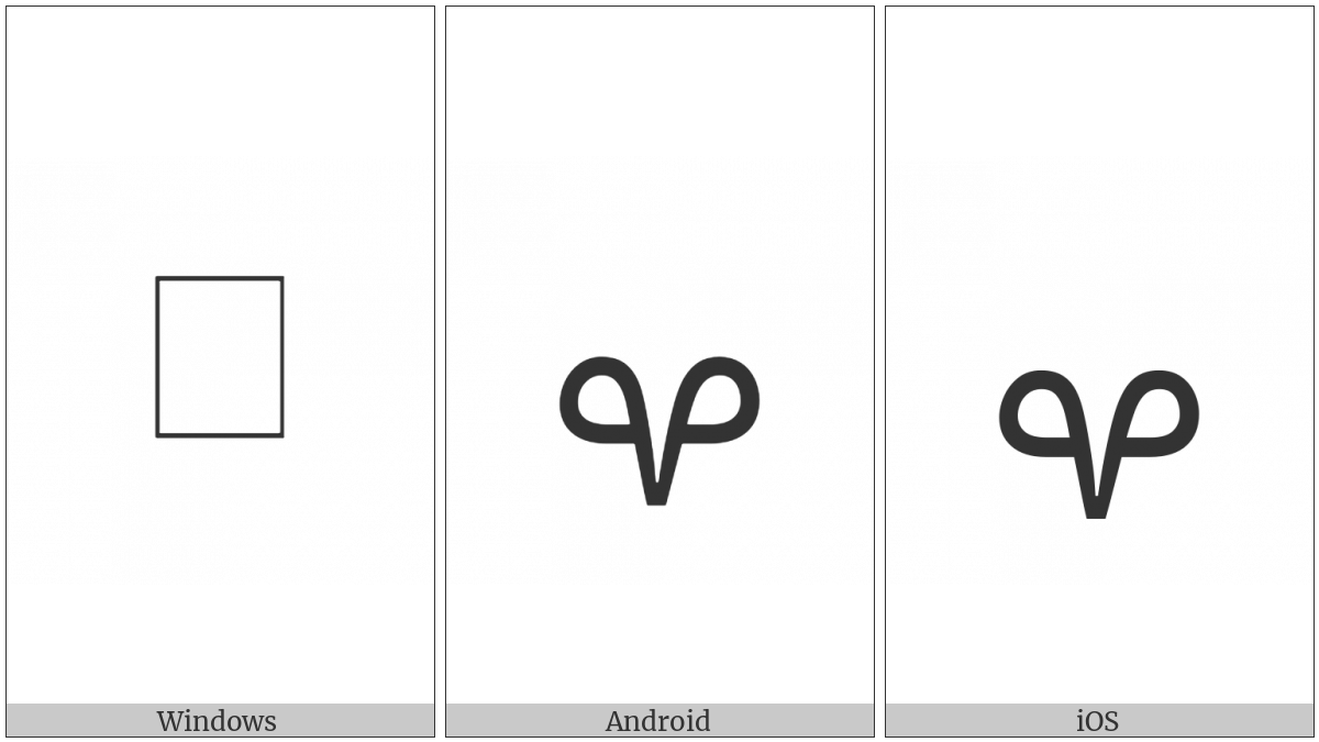 The image below shows how the “Mandaic Letter Ash” symbol might look like on different operating systems. If the font in which this web site is displayed does not contain the symbol and there is no fallback font able to render it, you can use the image below to get an idea of what it should look like.