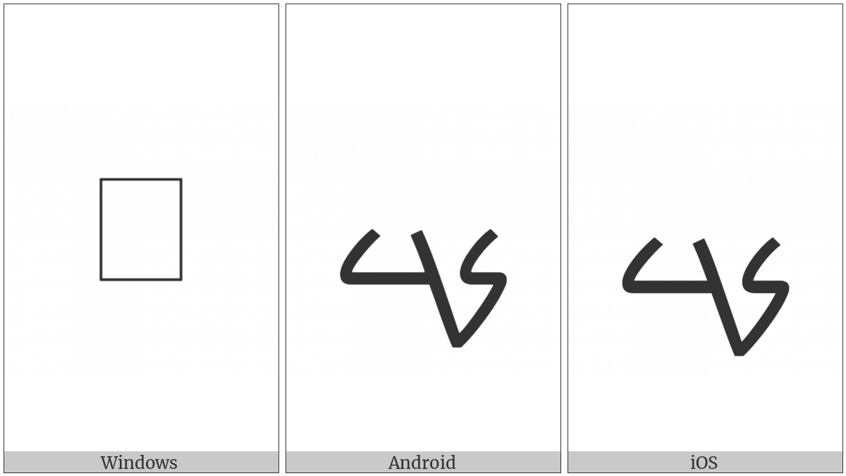The image below shows how the “Mandaic Letter Kad” symbol might look like on different operating systems. If the font in which this web site is displayed does not contain the symbol and there is no fallback font able to render it, you can use the image below to get an idea of what it should look like.