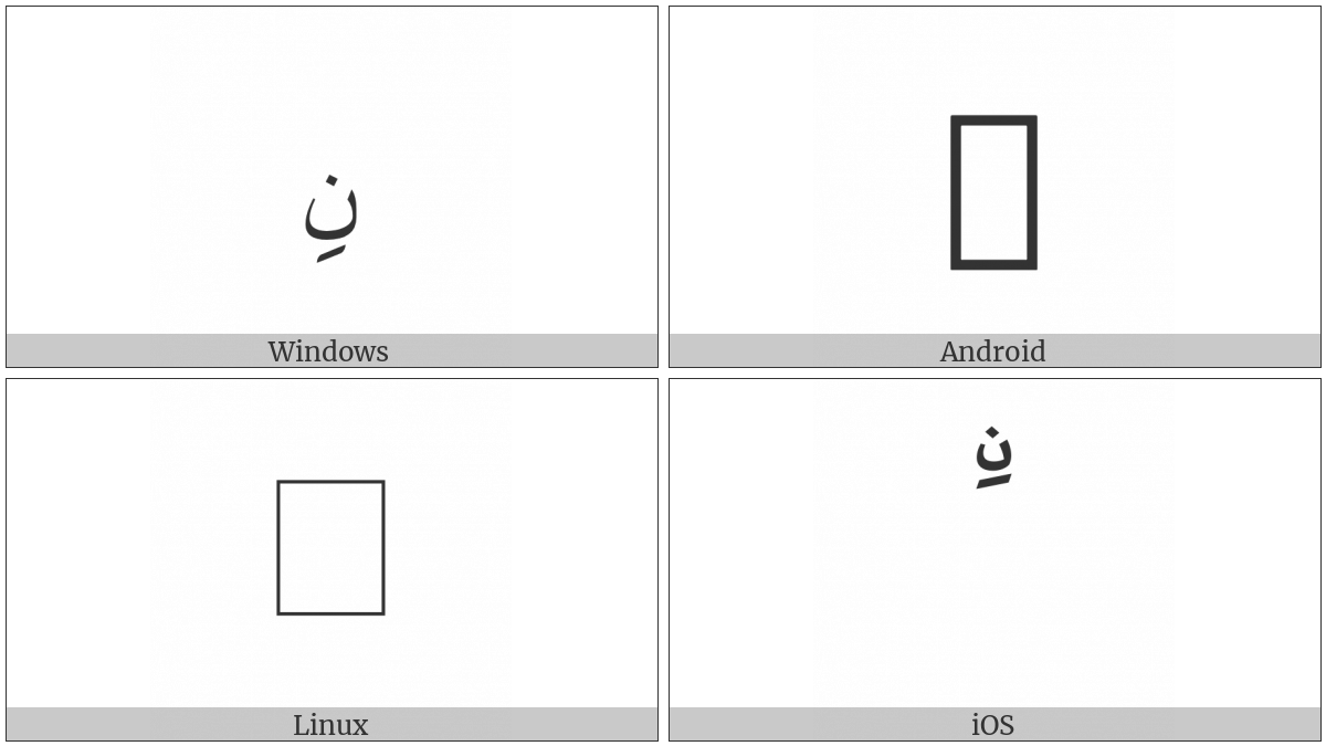 The image below shows how the “Arabic Small High Noon With Kasra” symbol might look like on different operating systems. If the font in which this web site is displayed does not contain the symbol and there is no fallback font able to render it, you can use the image below to get an idea of what it should look like.