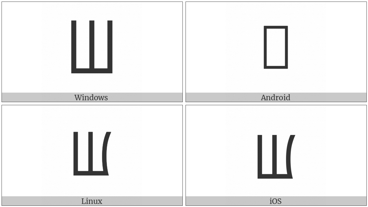 The image below shows how the “Phags-Pa Letter Ja” symbol might look like on different operating systems. If the font in which this web site is displayed does not contain the symbol and there is no fallback font able to render it, you can use the image below to get an idea of what it should look like.