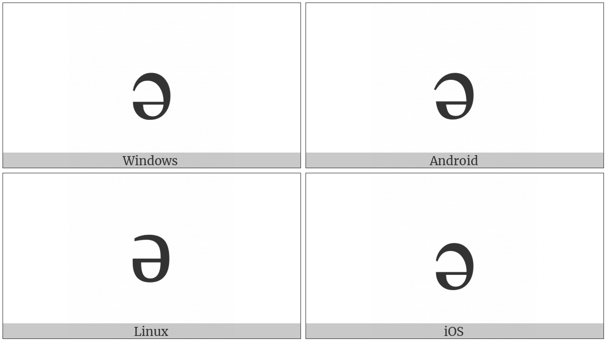 The image below shows how the “Latin Small Letter Turned E” symbol might look like on different operating systems. If the font in which this web site is displayed does not contain the symbol and there is no fallback font able to render it, you can use the image below to get an idea of what it should look like.