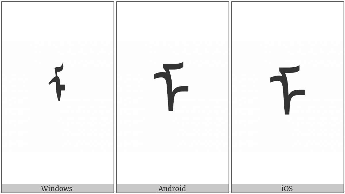 The image below shows how the “Mongolian Letter Ma” symbol might look like on different operating systems. If the font in which this web site is displayed does not contain the symbol and there is no fallback font able to render it, you can use the image below to get an idea of what it should look like.