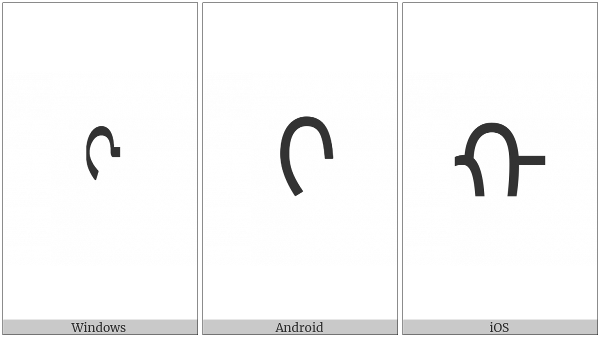 The image below shows how the “Mongolian Letter Sibe Ka” symbol might look like on different operating systems. If the font in which this web site is displayed does not contain the symbol and there is no fallback font able to render it, you can use the image below to get an idea of what it should look like.