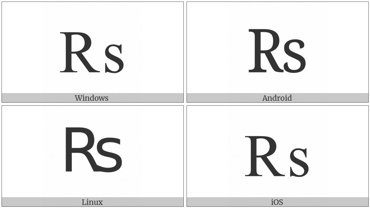 The image below shows how the “Rupee Sign” symbol might look like on different operating systems. If the font in which this web site is displayed does not contain the symbol and there is no fallback font able to render it, you can use the image below to get an idea of what it should look like.