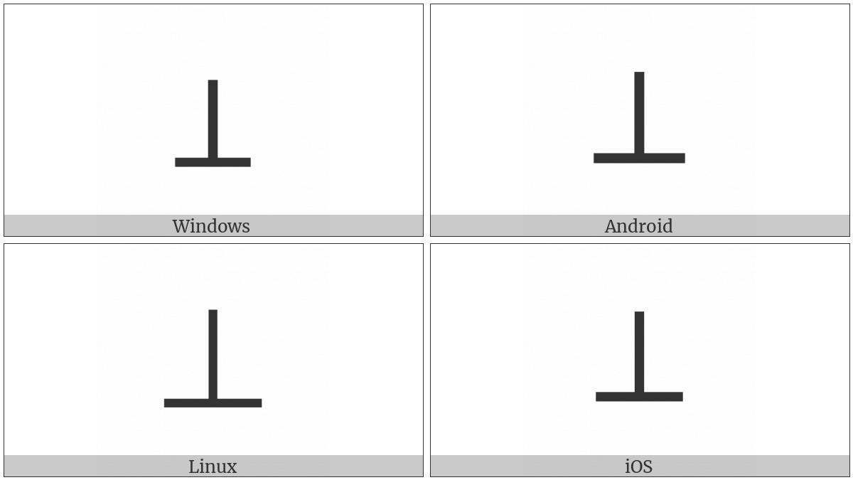 The image below shows how the “Up Tack” symbol might look like on different operating systems. If the font in which this web site is displayed does not contain the symbol and there is no fallback font able to render it, you can use the image below to get an idea of what it should look like.