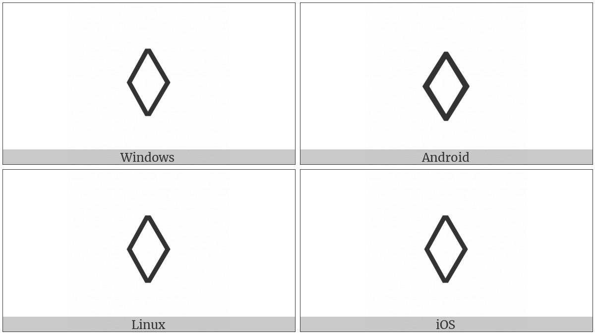 The image below shows how the “Lozenge” symbol might look like on different operating systems. If the font in which this web site is displayed does not contain the symbol and there is no fallback font able to render it, you can use the image below to get an idea of what it should look like.