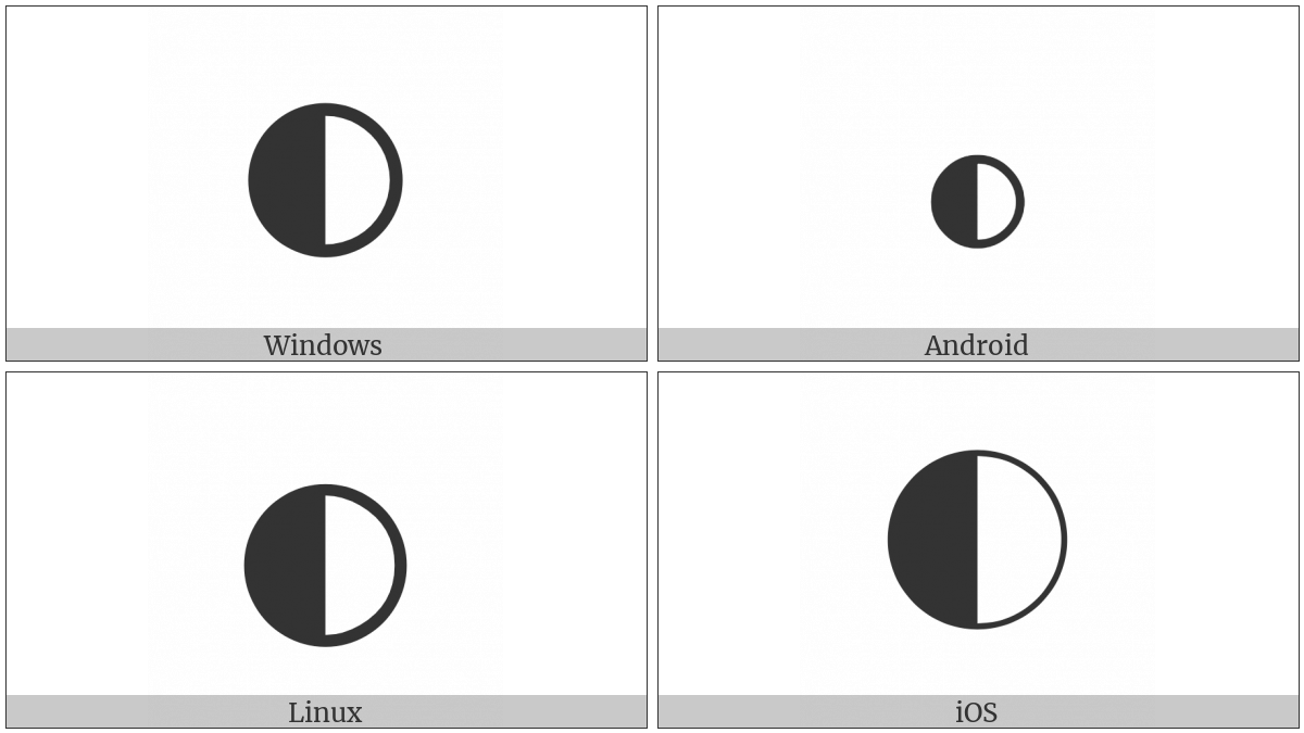 The image below shows how the “Circle With Left Half Black” symbol might look like on different operating systems. If the font in which this web site is displayed does not contain the symbol and there is no fallback font able to render it, you can use the image below to get an idea of what it should look like.
