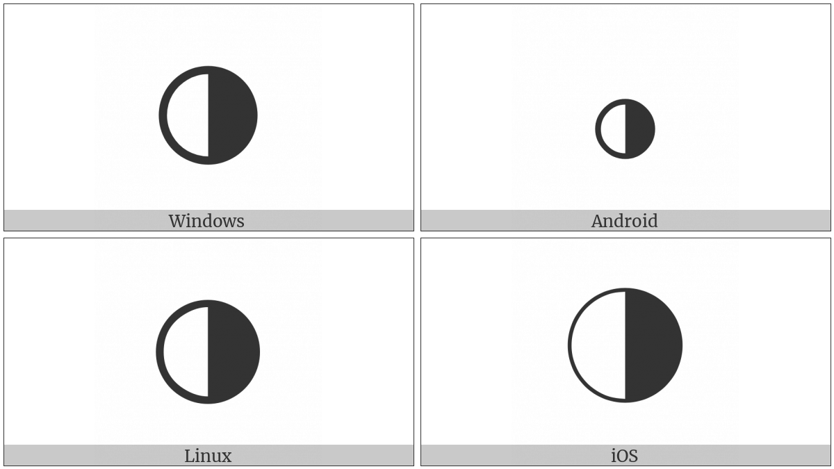 The image below shows how the “Circle With Right Half Black” symbol might look like on different operating systems. If the font in which this web site is displayed does not contain the symbol and there is no fallback font able to render it, you can use the image below to get an idea of what it should look like.