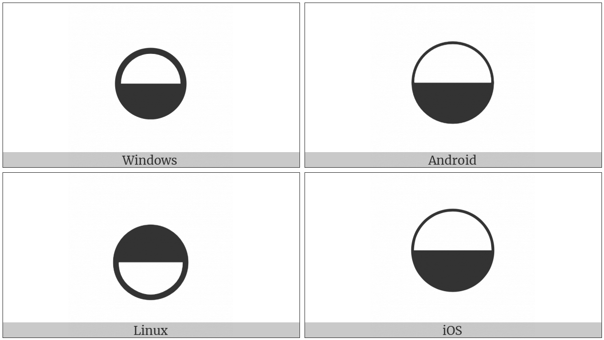 The image below shows how the “Circle With Lower Half Black” symbol might look like on different operating systems. If the font in which this web site is displayed does not contain the symbol and there is no fallback font able to render it, you can use the image below to get an idea of what it should look like.
