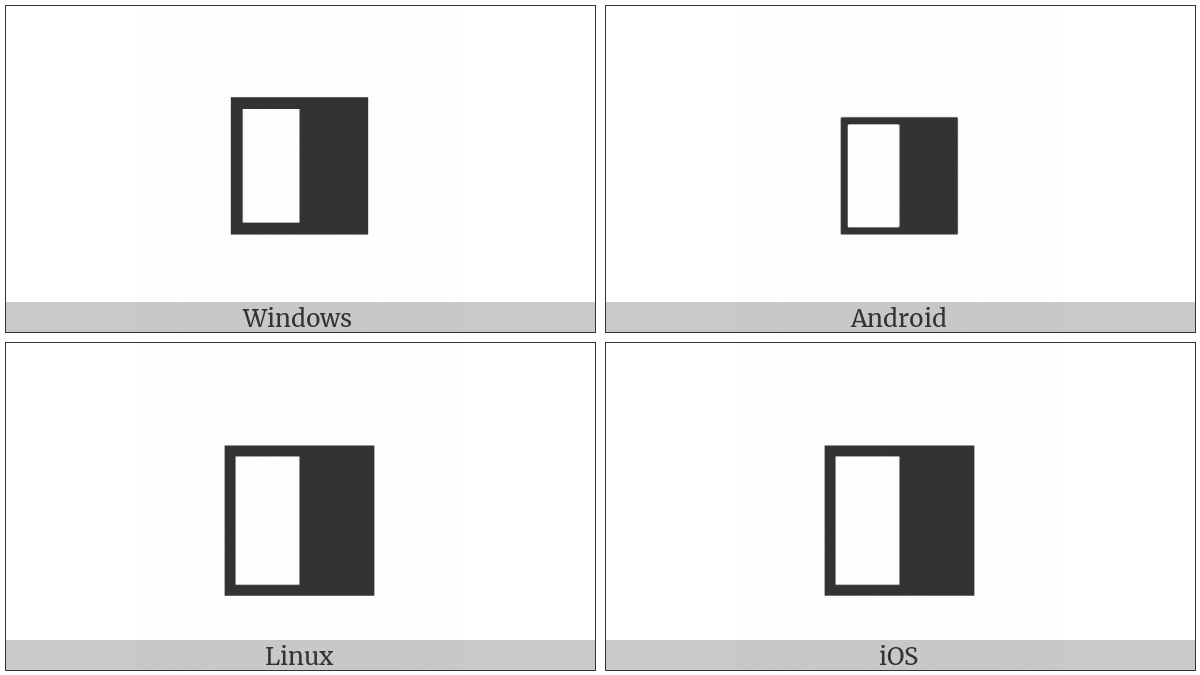 The image below shows how the “Square With Right Half Black” symbol might look like on different operating systems. If the font in which this web site is displayed does not contain the symbol and there is no fallback font able to render it, you can use the image below to get an idea of what it should look like.