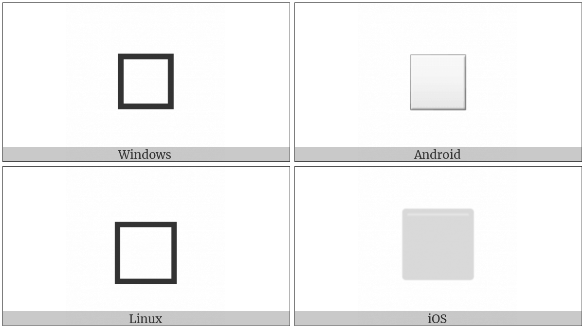 The image below shows how the “White Medium Square” symbol might look like on different operating systems. If the font in which this web site is displayed does not contain the symbol and there is no fallback font able to render it, you can use the image below to get an idea of what it should look like.