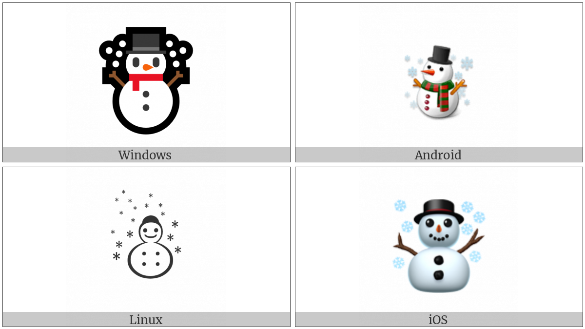 The image below shows how the “Snowman” symbol might look like on different operating systems. If the font in which this web site is displayed does not contain the symbol and there is no fallback font able to render it, you can use the image below to get an idea of what it should look like.