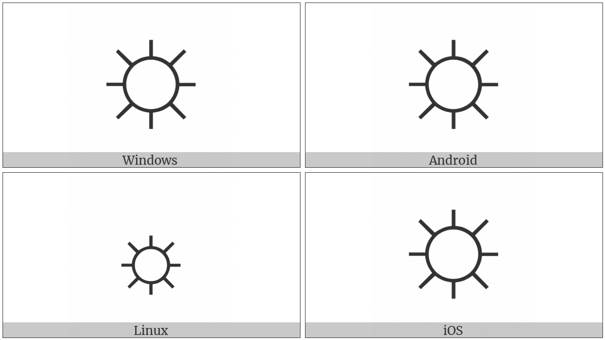 The image below shows how the “White Sun With Rays” symbol might look like on different operating systems. If the font in which this web site is displayed does not contain the symbol and there is no fallback font able to render it, you can use the image below to get an idea of what it should look like.