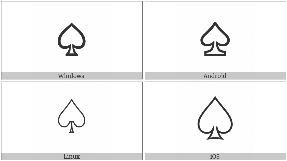 The image below shows how the “White Spade Suit” symbol might look like on different operating systems. If the font in which this web site is displayed does not contain the symbol and there is no fallback font able to render it, you can use the image below to get an idea of what it should look like.