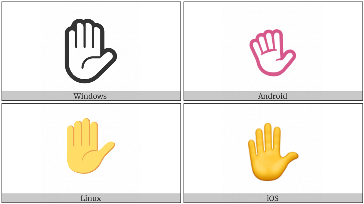 The image below shows how the “Raised Hand” symbol might look like on different operating systems. If the font in which this web site is displayed does not contain the symbol and there is no fallback font able to render it, you can use the image below to get an idea of what it should look like.