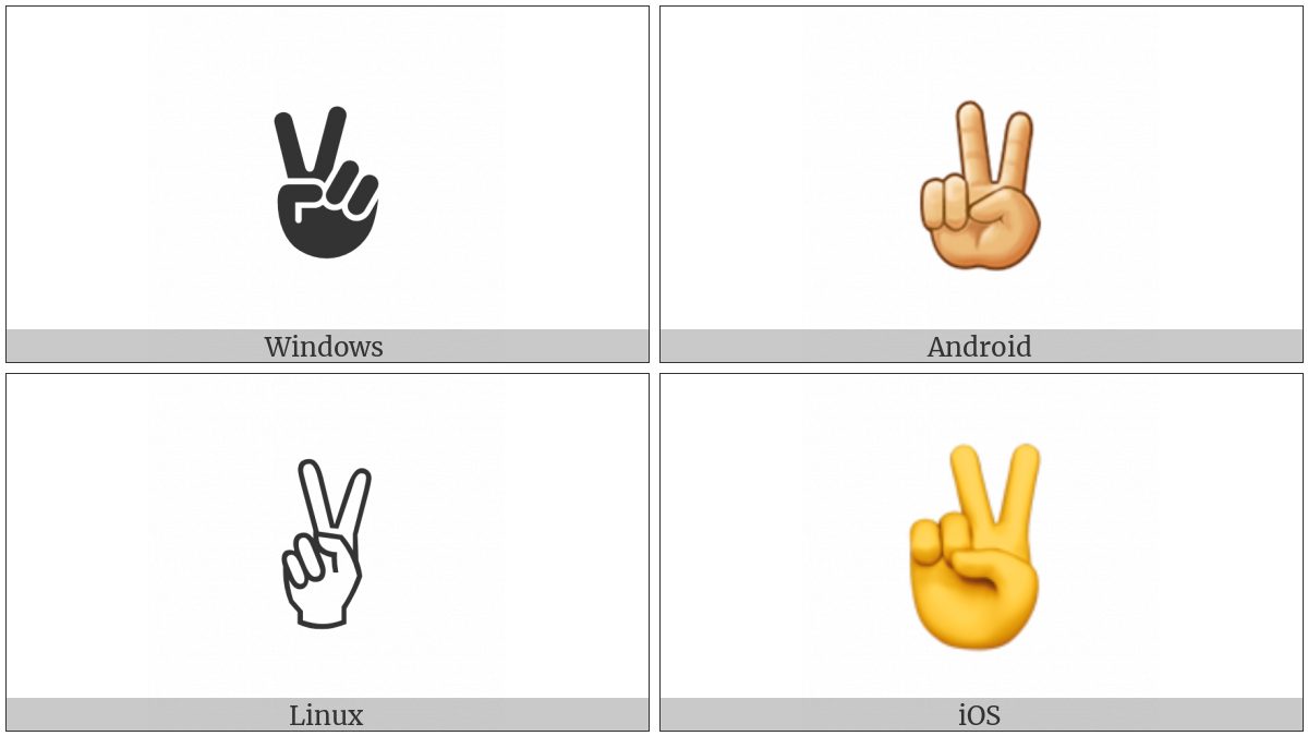 The image below shows how the “Victory Hand” symbol might look like on different operating systems. If the font in which this web site is displayed does not contain the symbol and there is no fallback font able to render it, you can use the image below to get an idea of what it should look like.