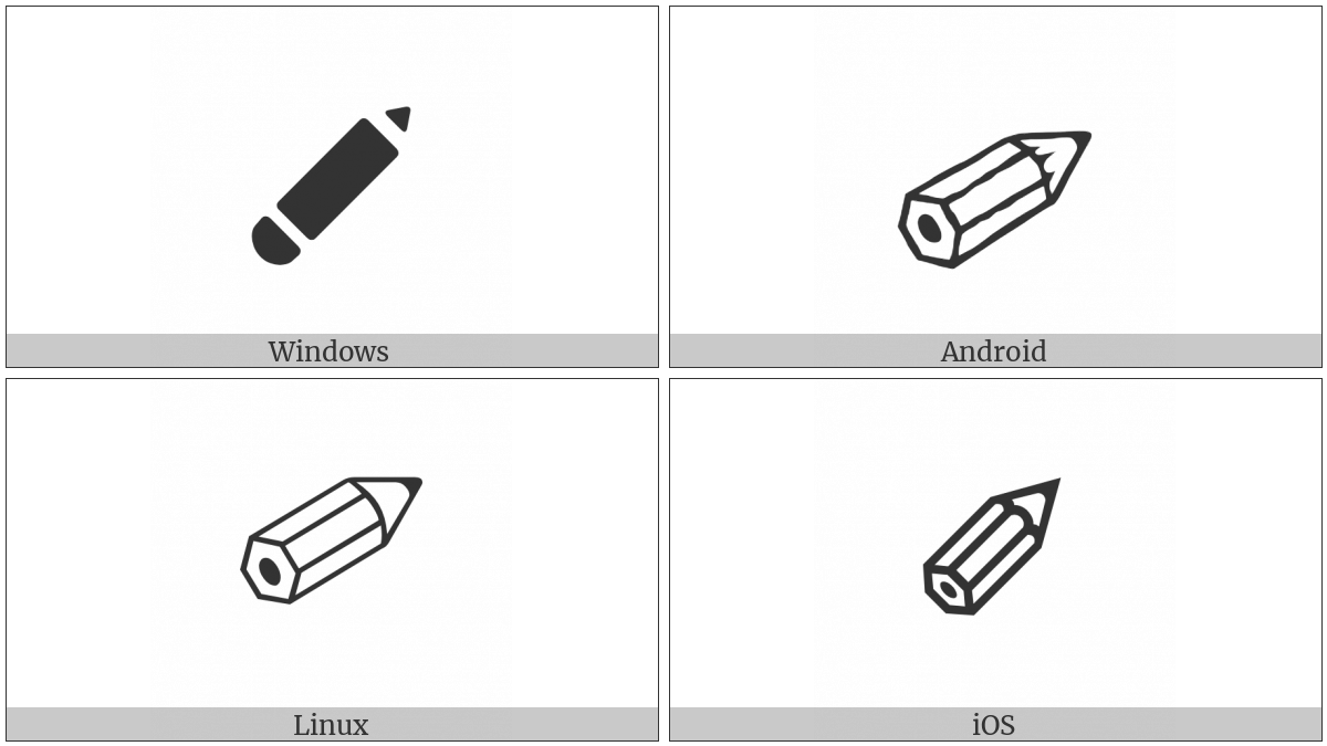 The image below shows how the “Upper Right Pencil” symbol might look like on different operating systems. If the font in which this web site is displayed does not contain the symbol and there is no fallback font able to render it, you can use the image below to get an idea of what it should look like.
