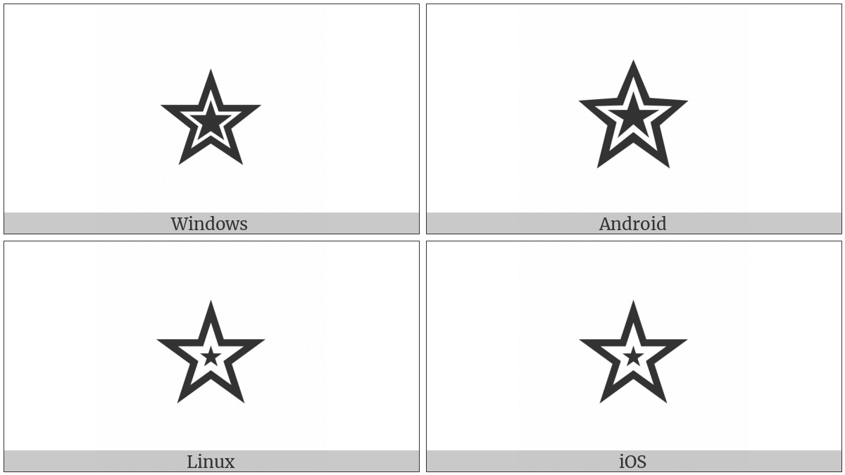 The image below shows how the “Heavy Outlined Black Star” symbol might look like on different operating systems. If the font in which this web site is displayed does not contain the symbol and there is no fallback font able to render it, you can use the image below to get an idea of what it should look like.