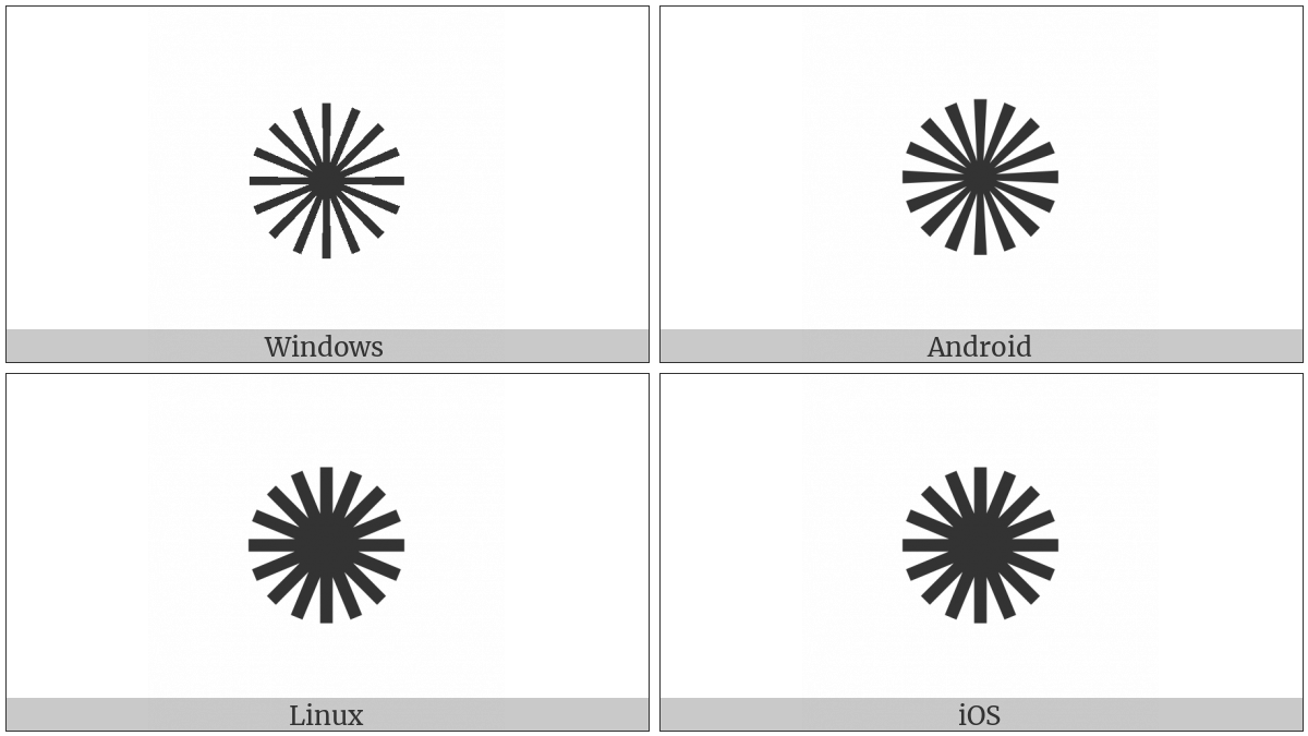The image below shows how the “Sixteen Pointed Asterisk” symbol might look like on different operating systems. If the font in which this web site is displayed does not contain the symbol and there is no fallback font able to render it, you can use the image below to get an idea of what it should look like.