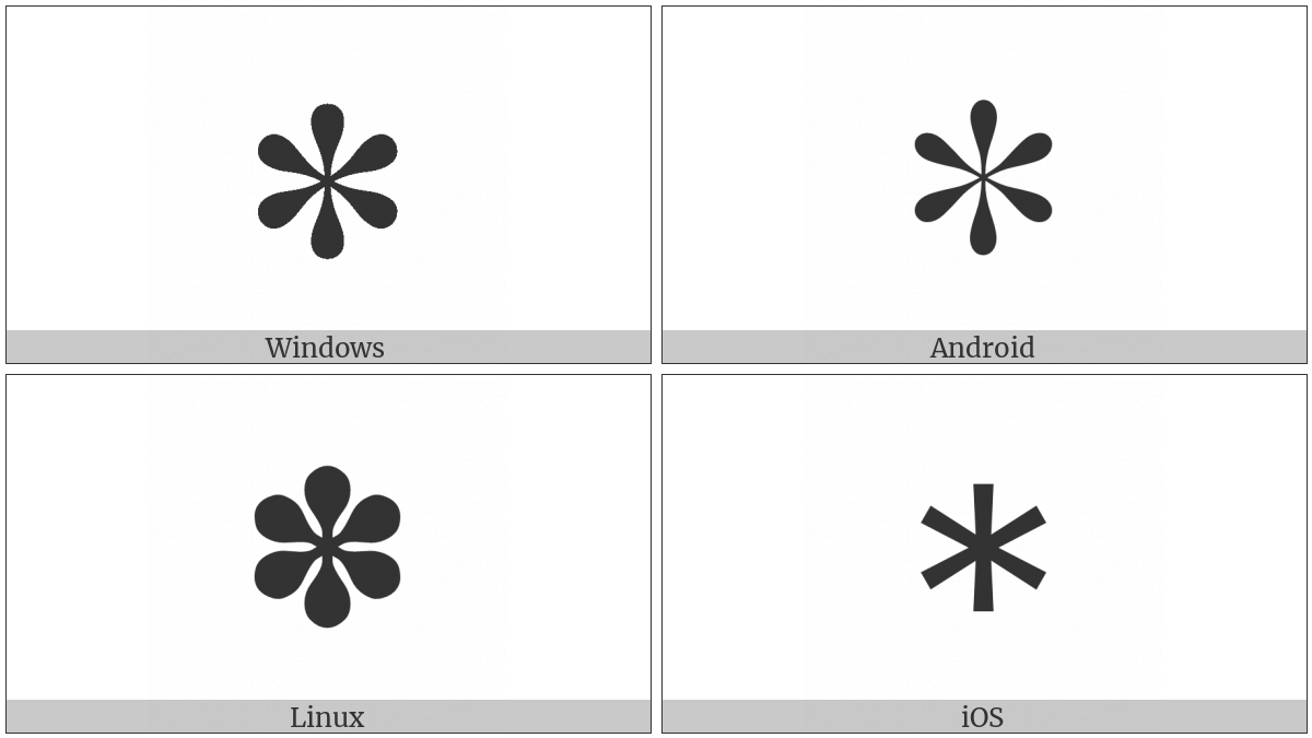 The image below shows how the “Heavy Teardrop-Spoked Asterisk” symbol might look like on different operating systems. If the font in which this web site is displayed does not contain the symbol and there is no fallback font able to render it, you can use the image below to get an idea of what it should look like.