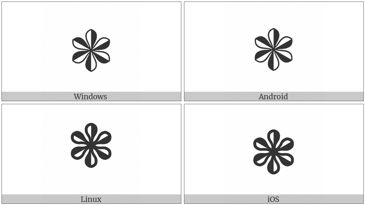 The image below shows how the “Heavy Teardrop-Spoked Pinwheel Asterisk” symbol might look like on different operating systems. If the font in which this web site is displayed does not contain the symbol and there is no fallback font able to render it, you can use the image below to get an idea of what it should look like.
