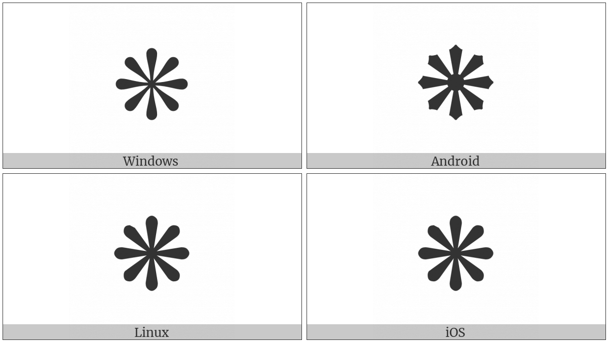 The image below shows how the “Heavy Eight Teardrop-Spoked Propeller Asterisk” symbol might look like on different operating systems. If the font in which this web site is displayed does not contain the symbol and there is no fallback font able to render it, you can use the image below to get an idea of what it should look like.