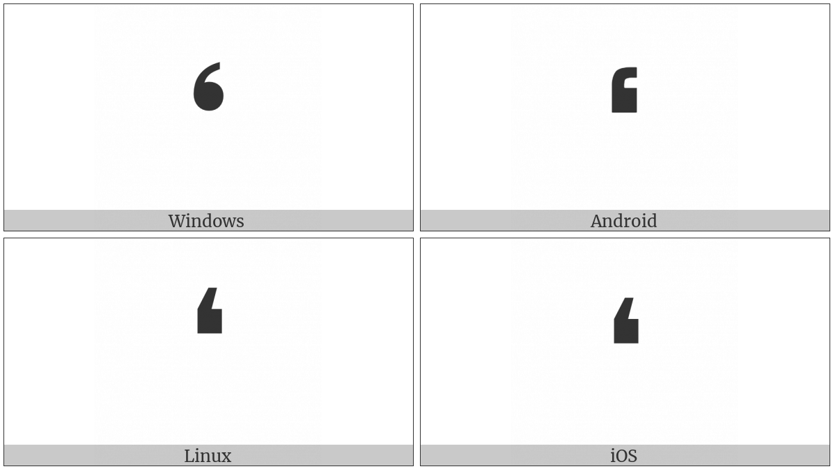 The image below shows how the “Heavy Single Turned Comma Quotation Mark Ornament” symbol might look like on different operating systems. If the font in which this web site is displayed does not contain the symbol and there is no fallback font able to render it, you can use the image below to get an idea of what it should look like.
