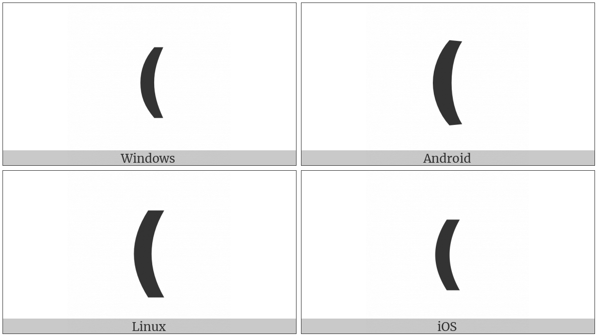 The image below shows how the “Medium Flattened Left Parenthesis Ornament” symbol might look like on different operating systems. If the font in which this web site is displayed does not contain the symbol and there is no fallback font able to render it, you can use the image below to get an idea of what it should look like.
