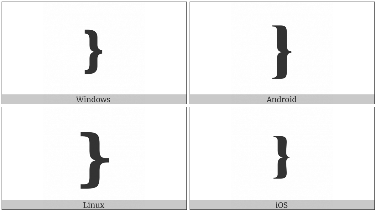The image below shows how the “Medium Right Curly Bracket Ornament” symbol might look like on different operating systems. If the font in which this web site is displayed does not contain the symbol and there is no fallback font able to render it, you can use the image below to get an idea of what it should look like.