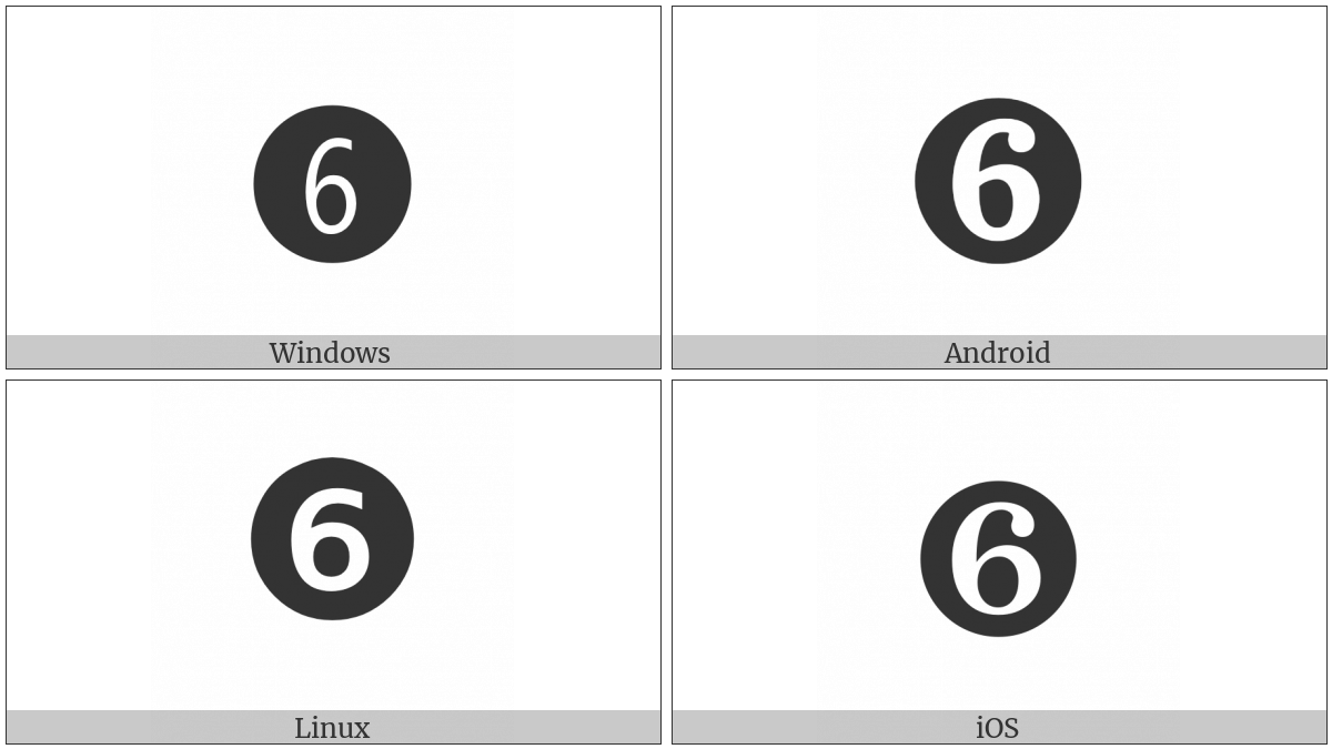 The image below shows how the “Dingbat Negative Circled Digit Six” symbol might look like on different operating systems. If the font in which this web site is displayed does not contain the symbol and there is no fallback font able to render it, you can use the image below to get an idea of what it should look like.