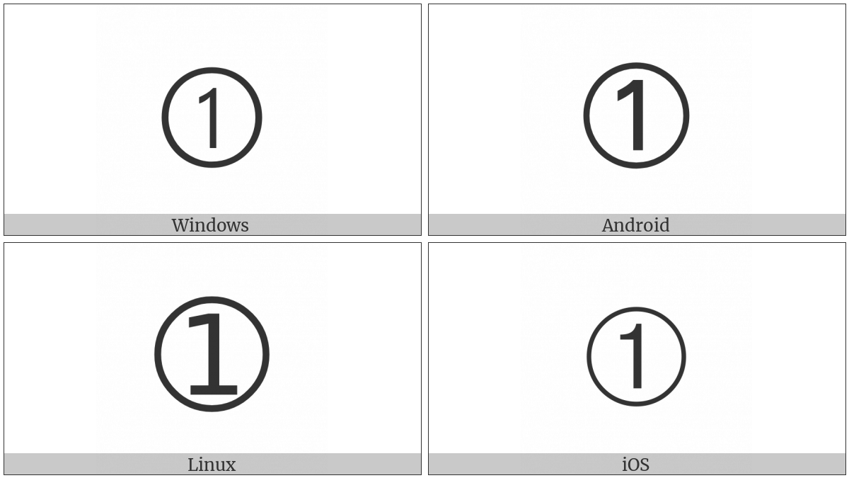 The image below shows how the “Dingbat Circled Sans-Serif Digit One” symbol might look like on different operating systems. If the font in which this web site is displayed does not contain the symbol and there is no fallback font able to render it, you can use the image below to get an idea of what it should look like.