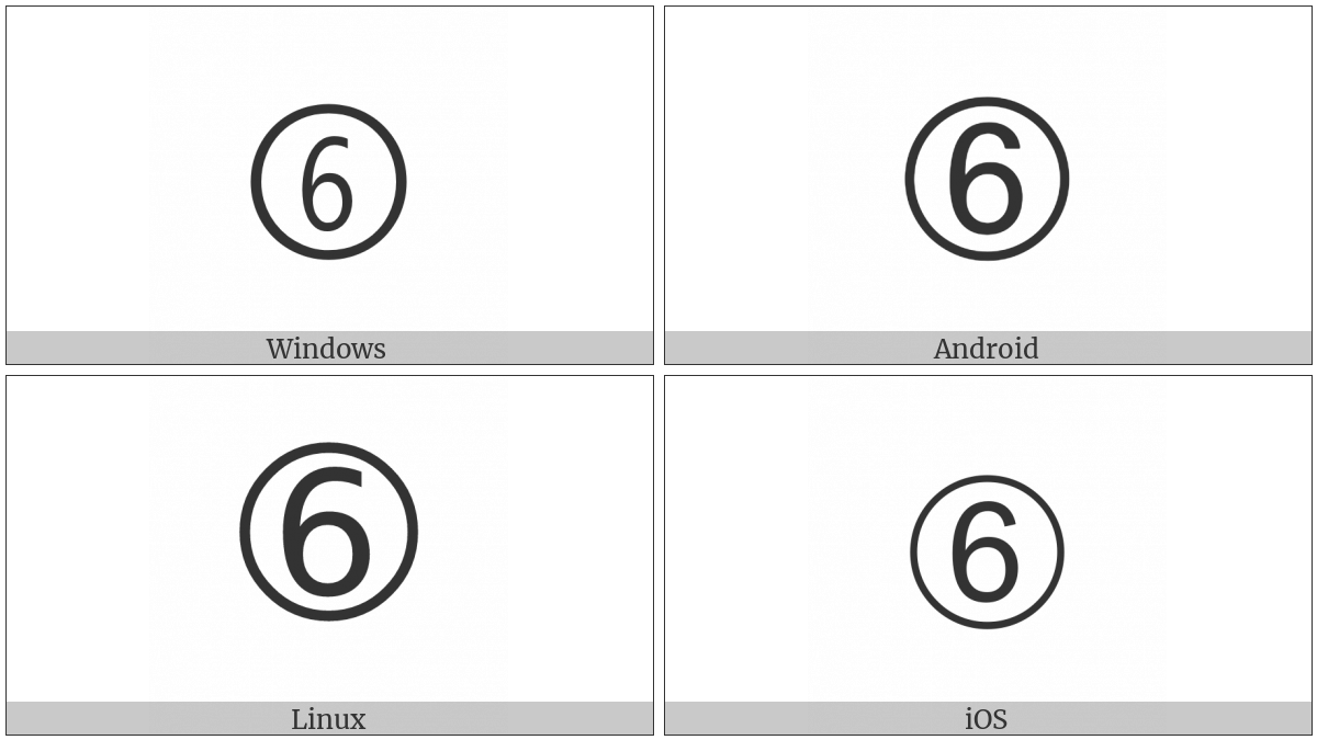 The image below shows how the “Dingbat Circled Sans-Serif Digit Six” symbol might look like on different operating systems. If the font in which this web site is displayed does not contain the symbol and there is no fallback font able to render it, you can use the image below to get an idea of what it should look like.