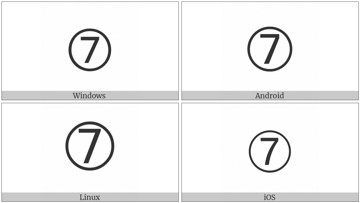 The image below shows how the “Dingbat Circled Sans-Serif Digit Seven” symbol might look like on different operating systems. If the font in which this web site is displayed does not contain the symbol and there is no fallback font able to render it, you can use the image below to get an idea of what it should look like.