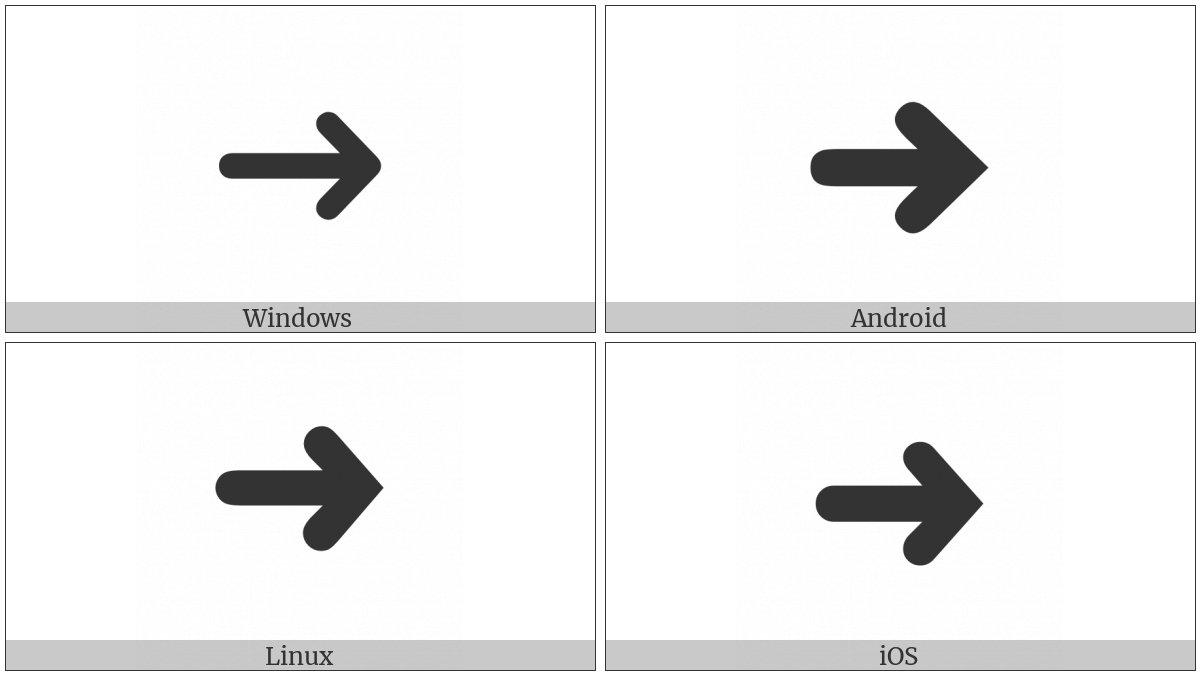 The image below shows how the “Heavy Round-Tipped Rightwards Arrow” symbol might look like on different operating systems. If the font in which this web site is displayed does not contain the symbol and there is no fallback font able to render it, you can use the image below to get an idea of what it should look like.