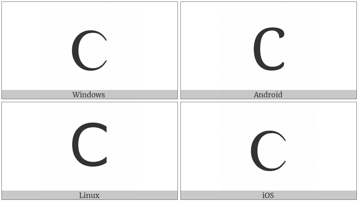 The image below shows how the “Greek Capital Lunate Sigma Symbol” symbol might look like on different operating systems. If the font in which this web site is displayed does not contain the symbol and there is no fallback font able to render it, you can use the image below to get an idea of what it should look like.