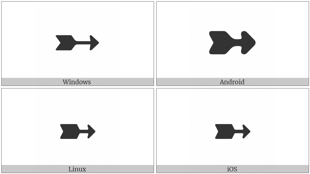 The image below shows how the “Wedge-Tailed Rightwards Arrow” symbol might look like on different operating systems. If the font in which this web site is displayed does not contain the symbol and there is no fallback font able to render it, you can use the image below to get an idea of what it should look like.
