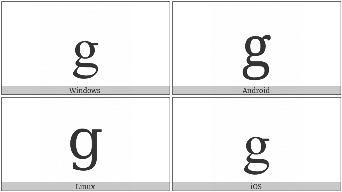 The image below shows how the “Latin Small Letter G” symbol might look like on different operating systems. If the font in which this web site is displayed does not contain the symbol and there is no fallback font able to render it, you can use the image below to get an idea of what it should look like.