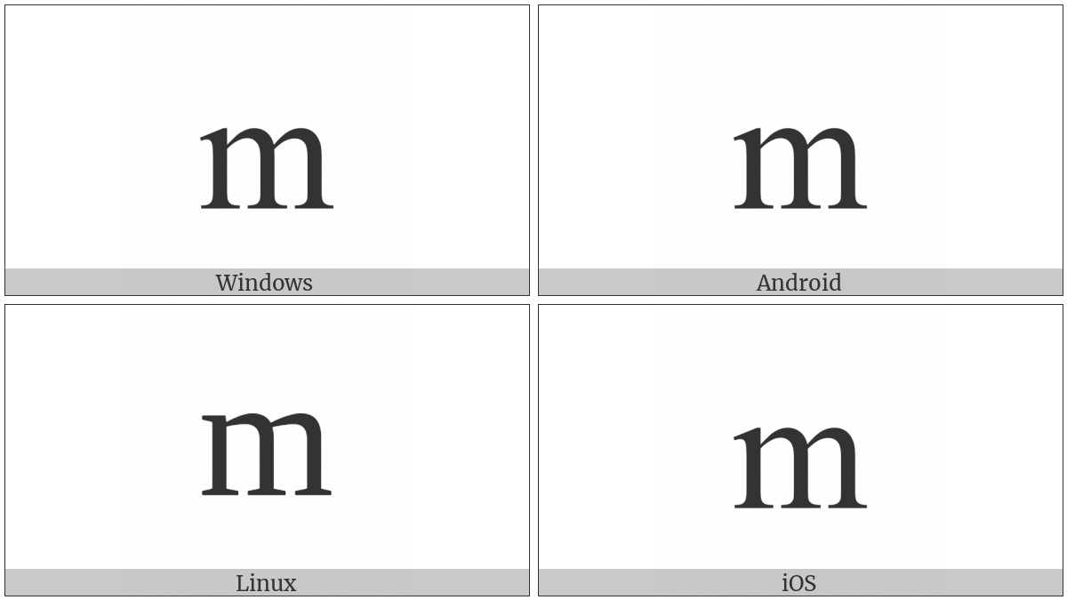 The image below shows how the “Latin Small Letter M” symbol might look like on different operating systems. If the font in which this web site is displayed does not contain the symbol and there is no fallback font able to render it, you can use the image below to get an idea of what it should look like.