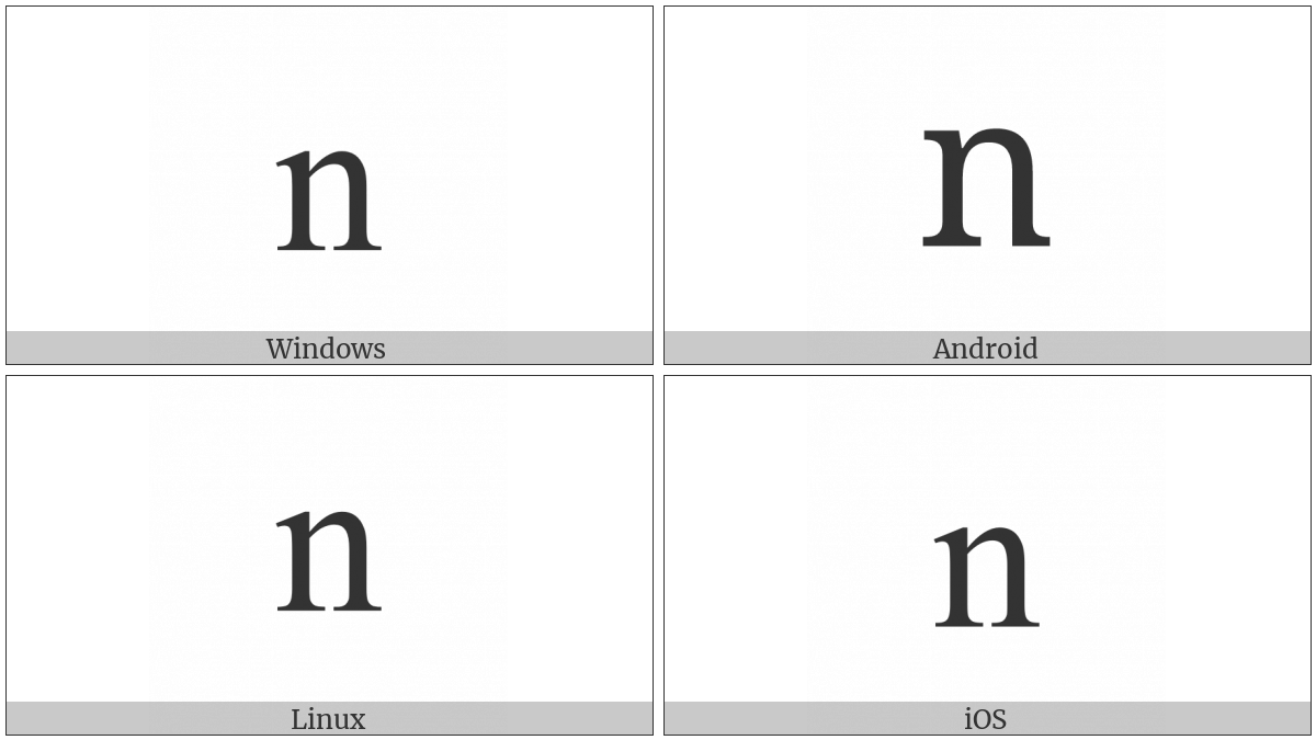 The image below shows how the “Latin Small Letter N” symbol might look like on different operating systems. If the font in which this web site is displayed does not contain the symbol and there is no fallback font able to render it, you can use the image below to get an idea of what it should look like.
