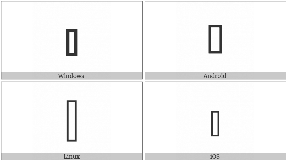 The image below shows how the “White Vertical Bar” symbol might look like on different operating systems. If the font in which this web site is displayed does not contain the symbol and there is no fallback font able to render it, you can use the image below to get an idea of what it should look like.