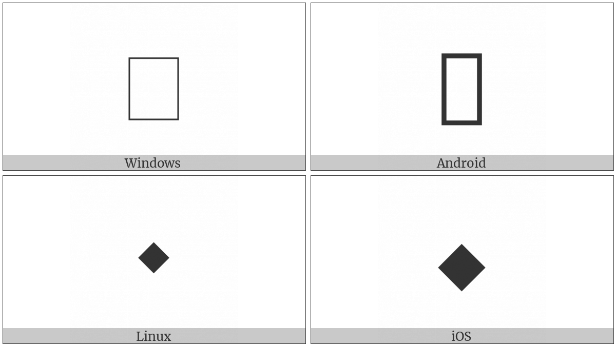 The image below shows how the “Black Small Diamond” symbol might look like on different operating systems. If the font in which this web site is displayed does not contain the symbol and there is no fallback font able to render it, you can use the image below to get an idea of what it should look like.