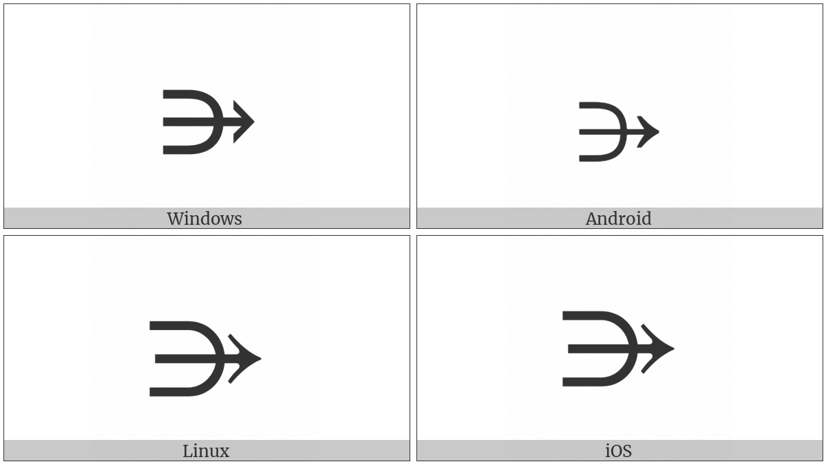 The image below shows how the “Rightwards Arrow Through Superset” symbol might look like on different operating systems. If the font in which this web site is displayed does not contain the symbol and there is no fallback font able to render it, you can use the image below to get an idea of what it should look like.