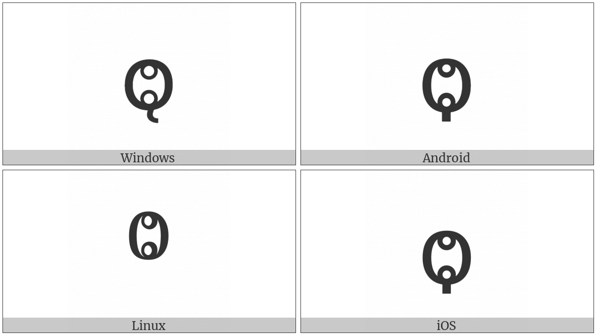 The image below shows how the “Glagolitic Small Letter Otu” symbol might look like on different operating systems. If the font in which this web site is displayed does not contain the symbol and there is no fallback font able to render it, you can use the image below to get an idea of what it should look like.