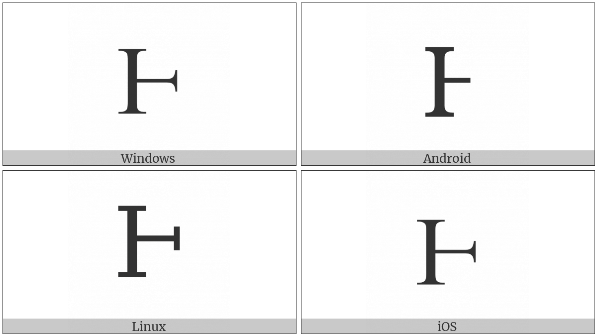 The image below shows how the “Latin Capital Letter Half H” symbol might look like on different operating systems. If the font in which this web site is displayed does not contain the symbol and there is no fallback font able to render it, you can use the image below to get an idea of what it should look like.